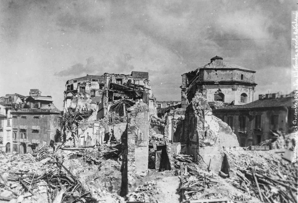 Ein Bild von den Schäden des Erdbebens am 28. Dezember 1908 in Messina. Es zeigt die „Via 1 Settembre“ und die „Vicolo la Kalami“. Bildquelle ist das Bildarchiv der ETH‑Bibliothek Zürich, veröffentlicht unter der Bildlizenz „public domain“ unter diesem Originalbildlink.