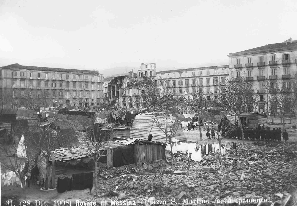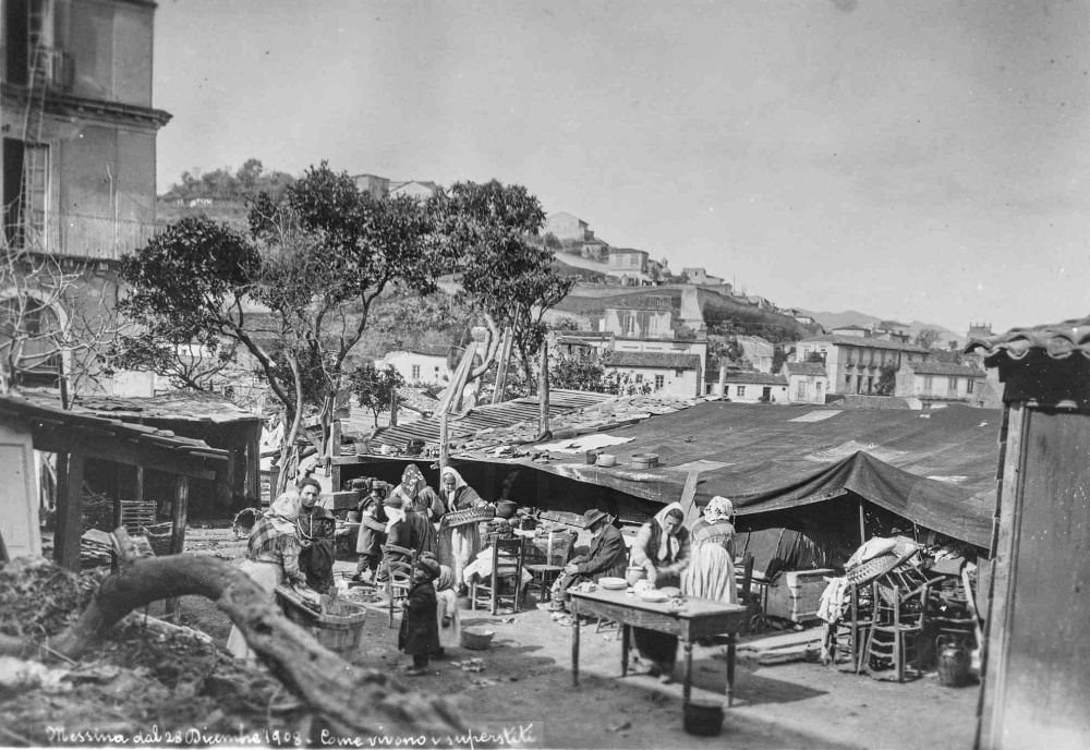 Ein Bild nach dem Erdbeben am 28. Dezember 1908 in Messina. Es zeigt, wie die Menschen notdürftig lebten. Bildquelle ist das Bildarchiv der ETH‑Bibliothek Zürich, veröffentlicht unter der Bildlizenz „public domain“ unter diesem Originalbildlink.