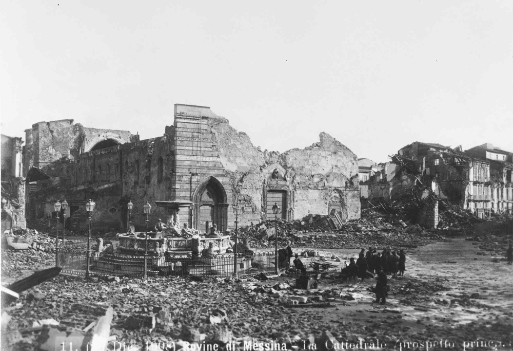 Ein Bild von den Schäden des Erdbebens am 28. Dezember 1908 in Messina. Es zeigt die zerstörte Kathedrale von Messina und den unbeschädigten Brunnen davor. Bildquelle ist das Bildarchiv der ETH‑Bibliothek Zürich, veröffentlicht unter der Bildlizenz „public domain“ unter diesem Originalbildlink.