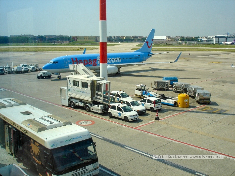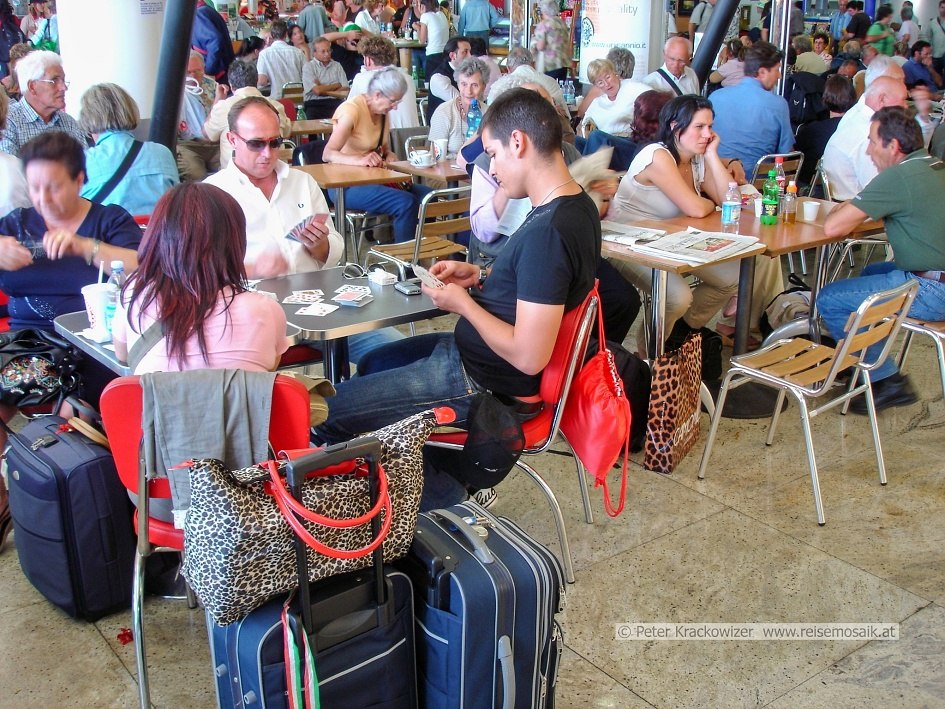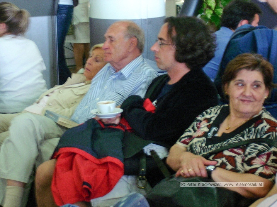 Der Check‑in für die Maschine – ich weiß nicht mehr wohin – ist vorbei. Die ersten im Bus, der zur Maschine fährt, warten jetzt schon zehn Minuten; denn die Italiener warten, bis wirklich alle da sind!