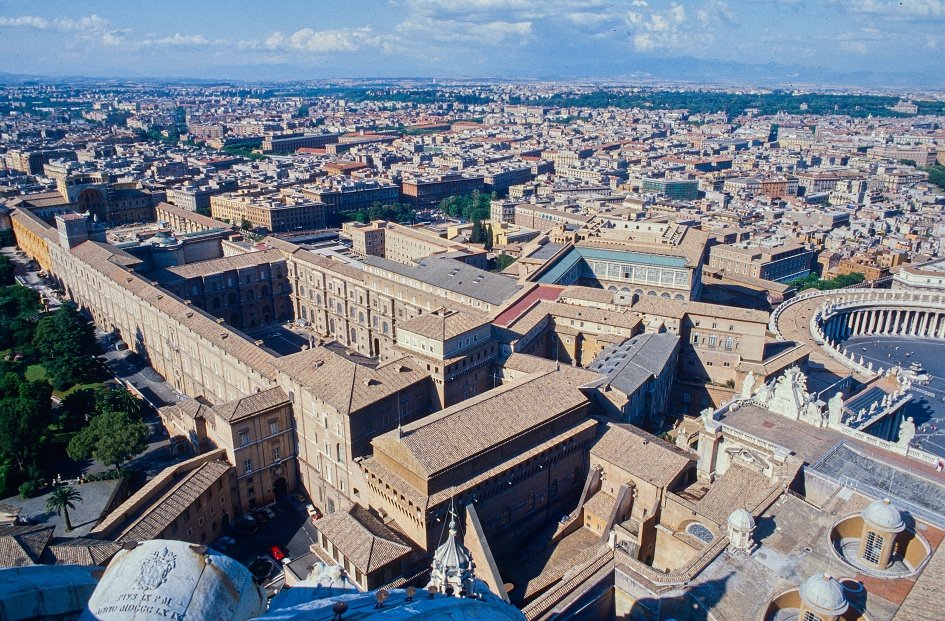 Der Dom von St. Peter ist das größte christliche Kirchenbauwerk der Welt. Der unter Kaiser Konstantin im 4. Jahrhundert begonnene Bau erhielt im 16. Jahrhundert seine heutige Gestalt. Der Dom ist 186 m lang (mit Vorhalle 211,5 m), 114,7 m breit und 119 m hoch bis zum Scheitel der Kuppel. Auf einer Grundfläche von 15 160 m² finden rund 60 000 Menschen Platz; der Petersplatz fasst über 100 000 Besucher. Zu den wichtigsten Kunstwerken zählen die „Pietà“ von Michelangelo, der Papstaltar Berninis (1633), der „Schwarze Petrus“ und die Sacre Grotte Vaticane mit zahlreichen Papstgräbern.