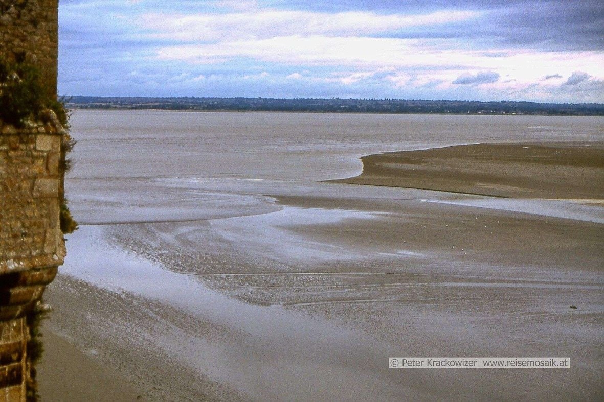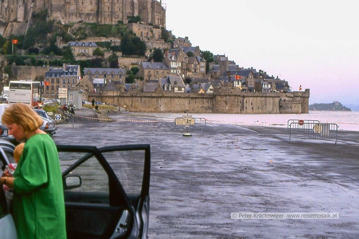 Der Parkplatz von Mont Saint-Michel bei Einsetzen der Flut im Sommer 1993