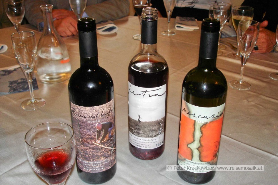 Wer es erschwinglicher und doch Künstlerisch haben möchte, der kann aber auch bei der Azienda Agrobiologica von Maurizio und Petra Rocchi vorbei schauen. Wohnen kann man dort zwar nicht, aber der Wein ist absolut biologisch hergestellt und Maurizio ist auch Künstler und bietet manchmal (auf Vorbestellung) auch Theateraufführungen auf seiner Azienda an. Jedes Jahr entwirft er neue Etiketten für seine Weine. Im Bild unten links ein Beispiel seiner Weine, rechts im Interview mit dem RAI Italia in den Stallungen des Palazzo Farnese in Caprarola (Nov 06). Leider gibt es noch keine Internetseite - aber schreiben kann man ihm: artwine[at]tin[dot]it