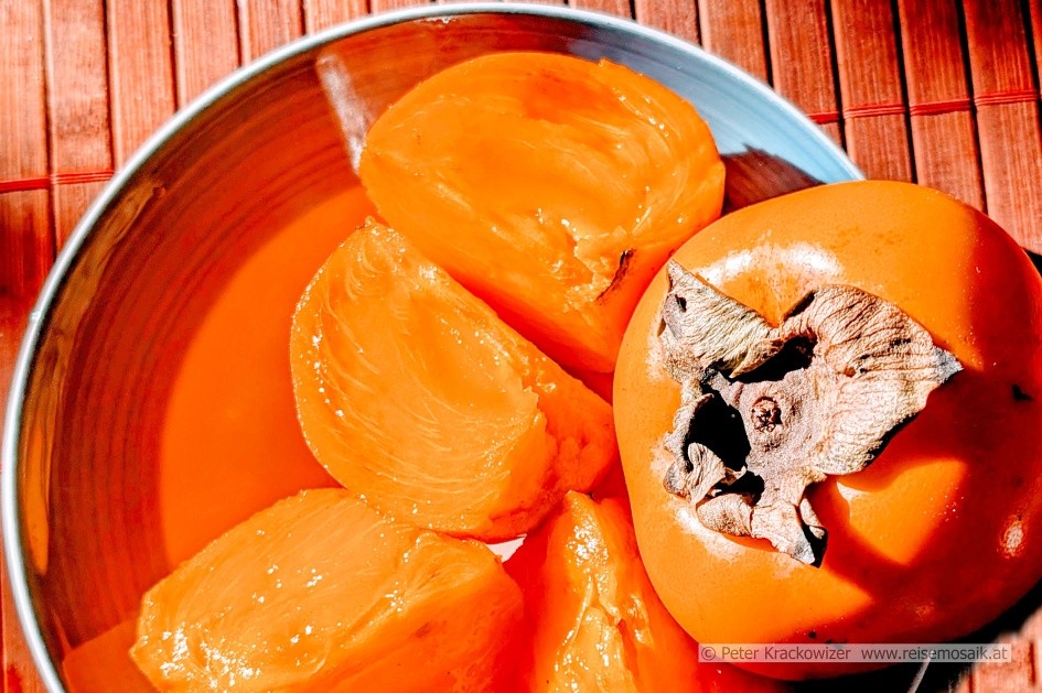 Kaki und Kiwi sind zwei Früchte, die schon seit langem in Italien angebaut werden. Ich erinnere mich an meine Reiseleitungen um 1990, bei denen ich immer eine spezielle Strecke von der Autostrada-Ausfahrt Affi nördlich von Verona nach Lazise am Gardasee fuhr. Denn entlang dieser Hänge gab es große Planagen von Kiwi zu sehen. Damals war das noch eine kleine Sensation, denn in der Werbung gab es nur Kiwis aus Australien. Die Kaki lernte ich erst Anfang der 1990er-Jahre kennen, als ich erstmals im November und Februar auf Reisen in Oberitalien war. Da konnte ich in vielen Gärten von Privathäusern Kakibäume sehen. Allerdings hatte ich damals nie eine Kaki probiert. Heute, in den 2020er-Jahren, gibt es sie in allen österreichischen Supermärkten zu kaufen.