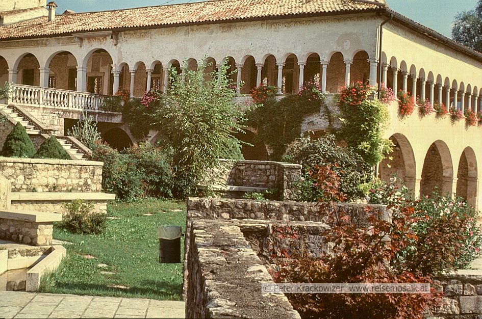 Gleich hinter Vittorio Veneto nehme ich wieder eine kleine Straße. Sie führt mich an einem kleinen See entlang. Das Castello Brandolini thront über dem Tal. Follina iegt vor mir, wo Mitte des 19. Jh. noch über tausend Arbeiter jährlich bis zu 200 000 kg Seide verarbeiteten. Mitten im Ort das Romantik-Hotel Abbazia, ein kleines romantisches Hotel. Schaut von außen gar nicht so aus, aber innen! Und gegenüber, der eigentliche Anziehungspunkt des heutigen Follina: Die Abtei! Im 12. Jh. erbaut, durchlebte es eine aufregende Geschichte, um heute als kraftvoller Ort der Ruhe inmitten eines Dorfes den Touristen zur inneren Einkehr aufzufordern. Durch einen kleinen Garten erklimme ich die Tür zum Kreuzgang, das Kirchenschiff voraus.