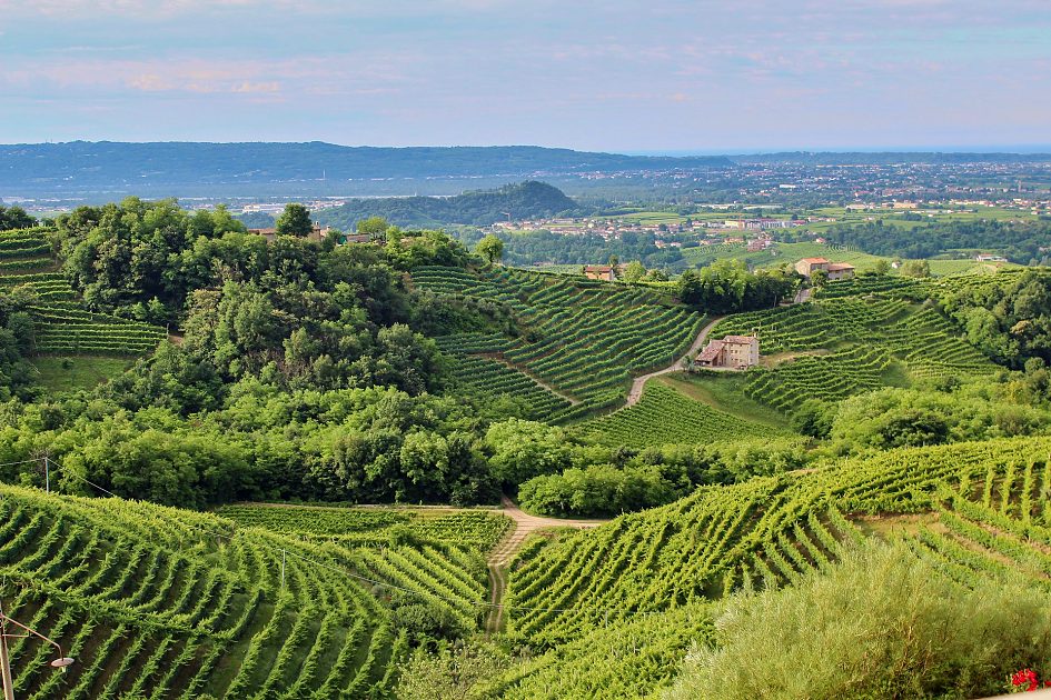 Valdobbiadene, das Zentrum der Weinproduktion, liegt am einen Ende dieser Landschaft, die aus einer anderen Welt zu stammen scheint. Conegliano am anderen.