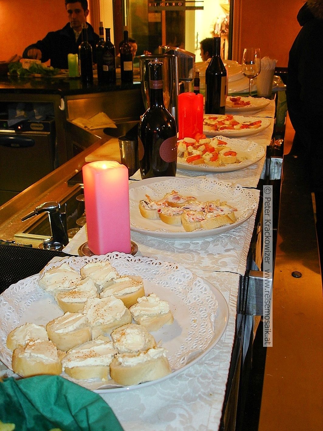 Eine italienische Bar ist etwas Feines: da geht man rein, bestellt auf die Schnelle einen Kaffee, ein Glas Wein oder ein Pizzastück... Aber nicht nur das: überall gibt es Kleinigkeiten zum Kosten: Nüsse, kleine belegte Brötchen, kleine Happen, Oliven und und und. Diese Happen sind sozusagen in der Konsumation eingerechnet und man bedient sich, meist mit Zahnstochern.