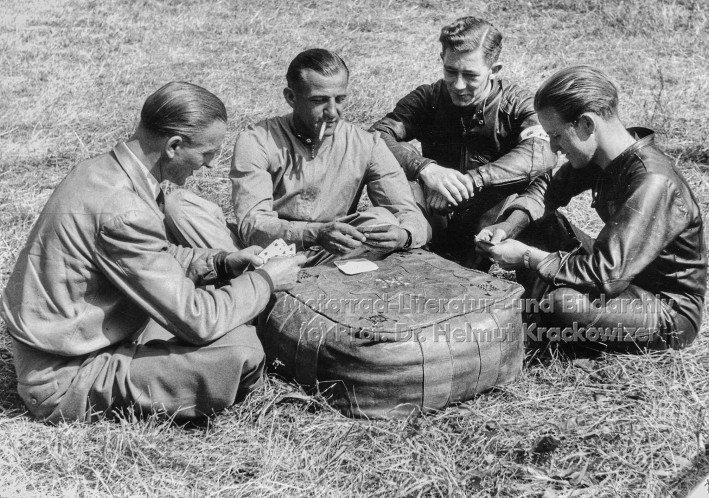 Vier Motorrad-Asse beim Kartenspielen zeigt das Bild links: v. l. n. r.