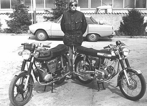 Das Bild rechts: Peter Krackowizer, 1975, links die erste KTM Comet "Grand Prix" RS 50 cm³ mit Alugussfelgen und Puch 50 cm³.