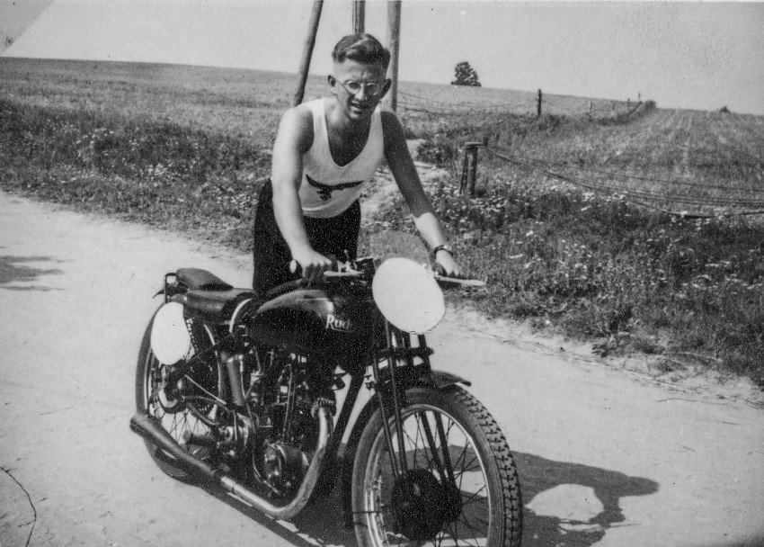 My father had been already infected from childhood with the “motor cycle-virus”, although his active motorcycle-racer career started not before the end of the Second World War. During that war he had been as a fighter controller of the air signal corps in a night interception troop. Thus he came 1943 on the Island Fehmarn in the Baltic Sea and his function allowed him also much time at leisure. At that time 21 years young, he dreamed to become a famous racer after the war. In 1938/39 he often rode on his 500 cm³ Norton "International" on the road between Lambach and Wels (Upper Austria) with approximately 130 km/h / 80 mph. Hardly any motor cycle rode at that time faster than his Norton. Until that day on which he had to look into the exhaust pipes of a 500 cm³ Rudge “Ulster”: Despite of 150 km/h / 93 mph according to his speedometer, he remained second. But nevertheless he remained a confirmed Norton driver!