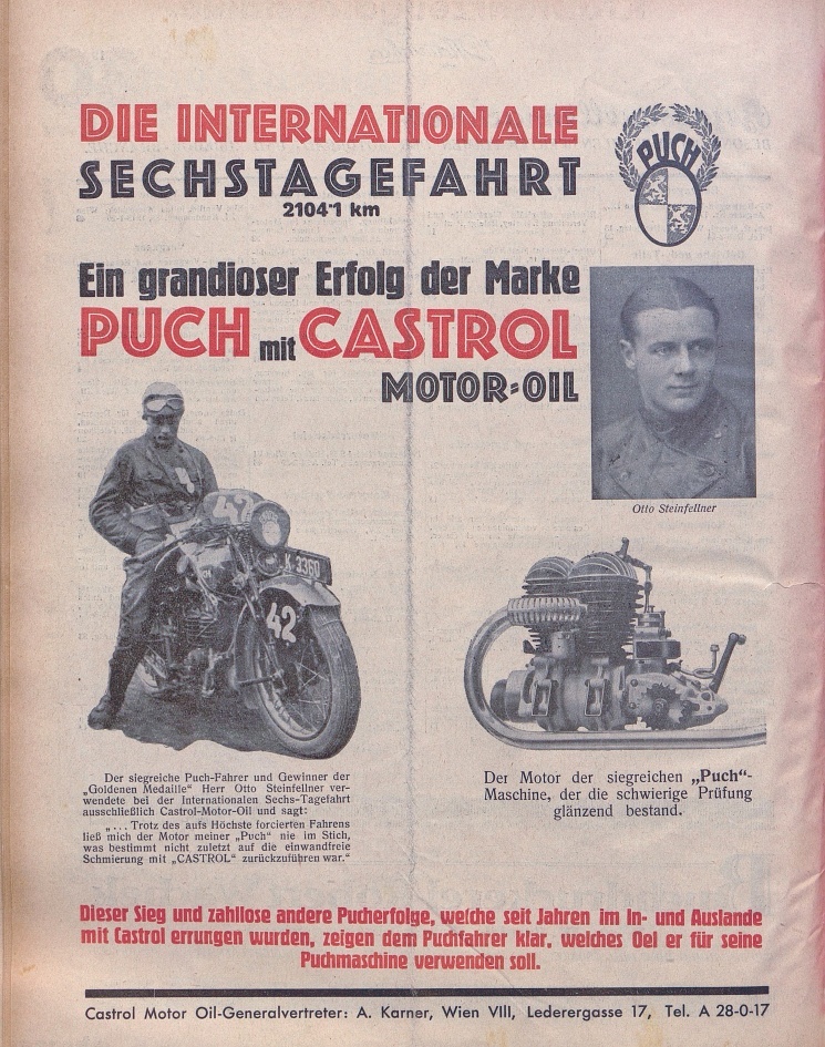 Von 1929 bis 1932 pilotierte er die Sagen umwobene Kompressor- Puch. Dann wechselte er zum Geländesport über, wo er ebenfalls zahlreiche Pokale und Auszeichnungen errang. 1935 bestritt er seine letzte aktive Sechs-Tage-Fahrt, um danach seinen großen Erfahrungsschatz als Leiter der Puch-Sportabteilung weiter zu geben.